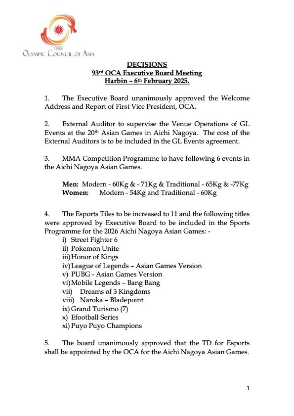 委員會還一致決定解散由OCA任命的、負責(zé)確定2026年愛知名古屋亞洲運動會電子競技項目的工作組(Task Force),因為電子競技項目已由OCA執(zhí)行委員會批準(zhǔn)。